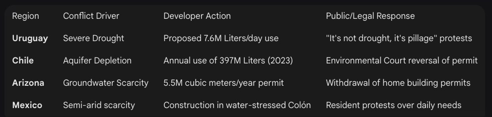 The industry frequently employs a “wait and see” approach to water permitting, often operating without tracking their true usage. A 2021 survey found that only 51% of data center operators track water consumption, and even fewer monitor it across their entire facility portfolio.18 In regions like Uruguay, which recently suffered a three-year drought so severe that authorities mixed seawater with freshwater to sustain the supply, the introduction of a new Google data center sparked massive protests under the slogan “It’s not drought, it’s pillage”.20 The proposed facility was projected to consume 7.6 million liters of freshwater daily—usage that residents argued was catastrophic given the national water insecurity.20