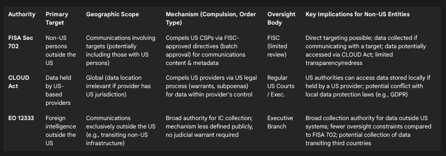 US surveillance laws like FISA Section 702 and Executive Order 12333 are explicitly designed or operationally function to collect intelligence from non-US persons located outside the United States.3 While Section 702 requires targeting non-US persons abroad, the nature of global communications means this "incidental" collection inevitably sweeps up vast quantities of data belonging to individuals worldwide who communicate with targets or simply use US-based platforms.4 EO 12333 allows for broad collection outside the US with even fewer constraints.4