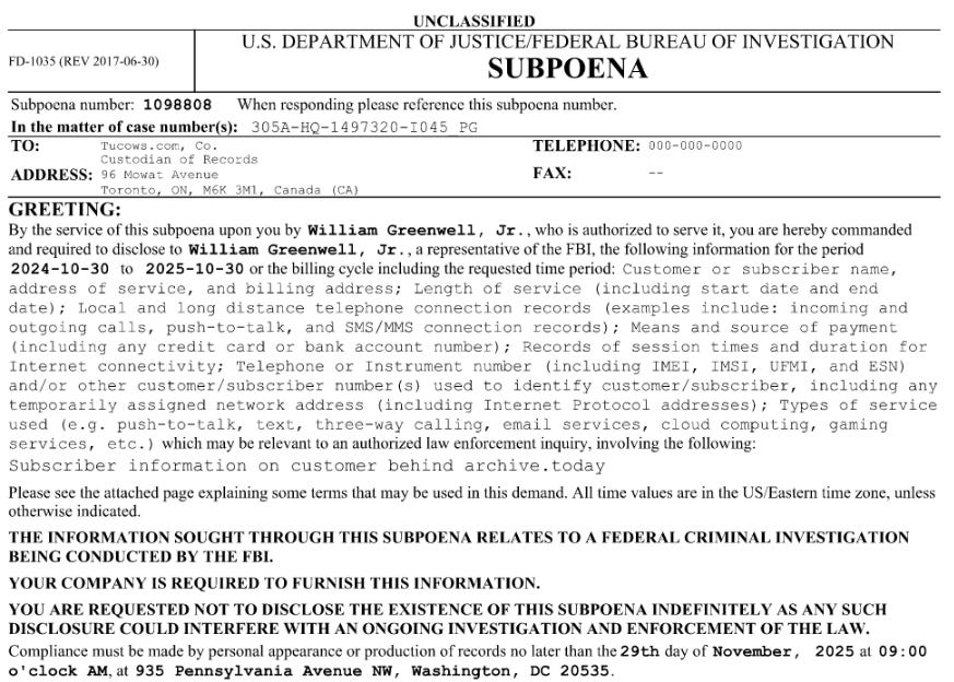 The FBI’s subpoena, sent to the Canadian domain registrar Tucows, demanded the full identity, billing information, phone records, and connection data of the individual behind archive.today. The subpoena explicitly ordered Tucows not to disclose its existence to the target, invoking secrecy provisions commonly used in national security or criminal probes. While such measures are not unprecedented, applying them to a global information archive raises far-reaching implications.