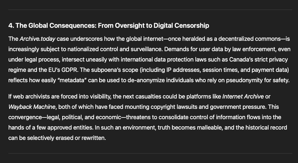 In summary, the archive.today subpoena illustrates a new front in the struggle between freedom of information and censorship—where the state’s appetite for control meets the internet’s fragile architecture of transparency. The outcome will shape not just how we access information, but whether the past itself remains free.