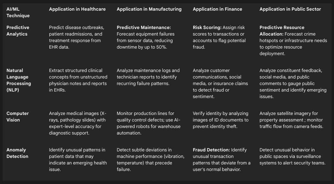 AI and ML are not merely analytical tools; they represent a fundamental shift in the ability to process and interpret data at a scale and complexity previously unimaginable. By learning from data to identify patterns, make predictions, and automate decisions, these technologies can unlock the value hidden within previously inaccessible data sources. The following table maps key AI/ML techniques to their specific, high-impact applications across the analyzed sectors.