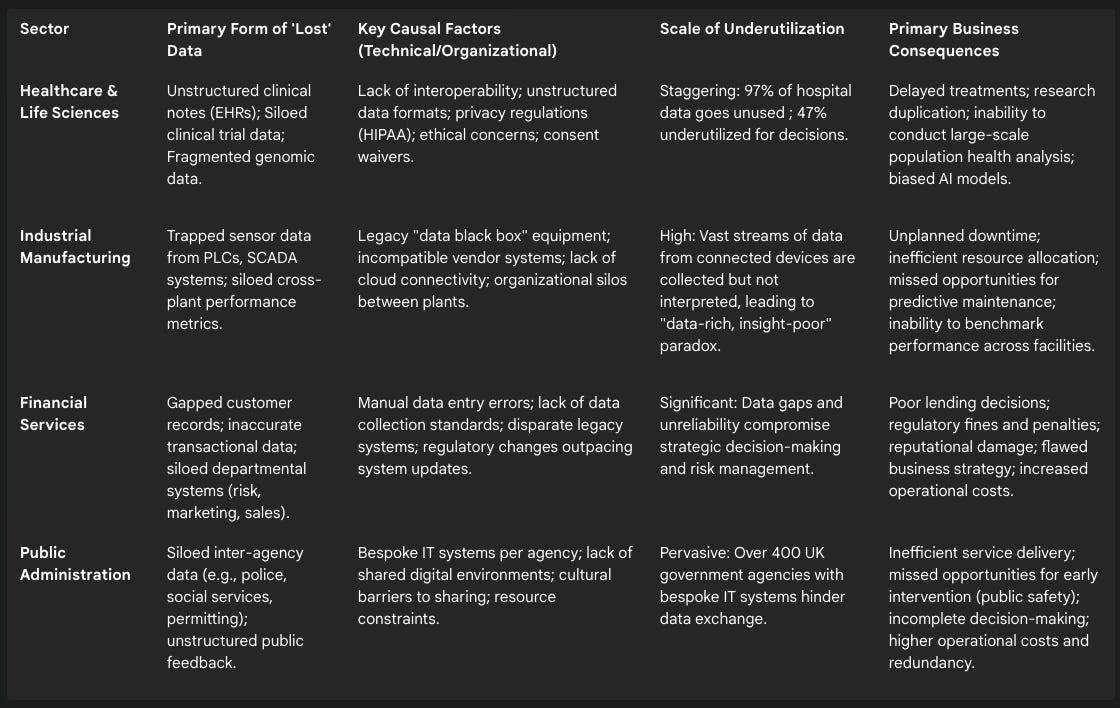 The abstract concept of “lost data” manifests in unique and challenging ways across different industries. An examination of four critical sectors—Healthcare and Life Sciences, Industrial Manufacturing, Financial Services, and Public Administration—reveals distinct causal factors, scales of underutilization, and tangible consequences. The following table provides a strategic, cross-sectoral overview of these challenges.