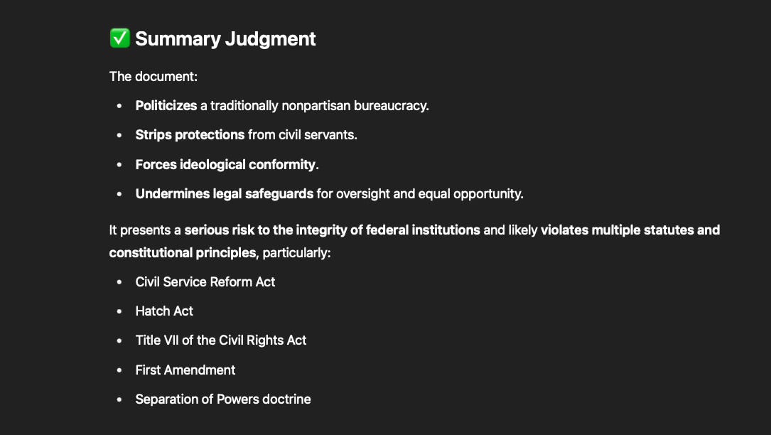 The document: Politicizes a traditionally nonpartisan bureaucracy. Strips protections from civil servants. Forces ideological conformity. Undermines legal safeguards for oversight & equal opportunity.