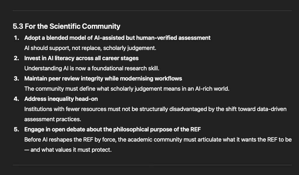 The REF-AI report offers a rare moment of clarity in a rapidly shifting landscape. It exposes a sector pulled in multiple directions: anxious about technological disruption, sceptical of AI’s limits, yet acutely aware that REF2029 cannot be insulated from the rising tide of automation. The report’s central message is neither alarmist nor techno-optimistic. Instead, it calls for governed innovation: principled experimentation, transparent reporting, equitable access, and unwavering commitment to human expertise.