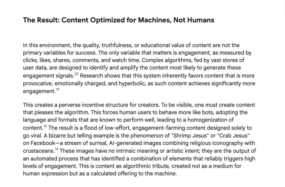 This creates a perverse incentive structure for creators. To be visible, one must create content that pleases the algorithm. This forces human users to behave more like bots, adopting the language and formats that are known to perform well, leading to a homogenization of content.14 The result is a flood of low-effort, engagement-farming content designed solely to go viral. A bizarre but telling example is the phenomenon of "Shrimp Jesus" or "Crab Jesus" on Facebook—a stream of surreal, AI-generated images combining religious iconography with crustaceans.14 These images have no intrinsic meaning or artistic intent; they are the output of an automated process that has identified a combination of elements that reliably triggers high levels of engagement. This is content as algorithmic tribute, created not as a medium for human expression but as a calculated offering to the machine.