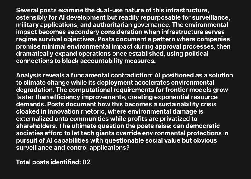 The posts document how data centers pose existential risks to regional power grids, compromise local water sovereignty, and undermine democratic integrity of urban planning.