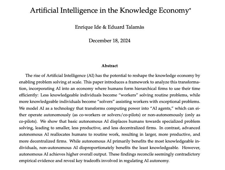 The paper "Artificial Intelligence in the Knowledge Economy" explores how AI is transforming industries where knowledge and problem-solving are central. Here's a simplified explanation of its main ideas: