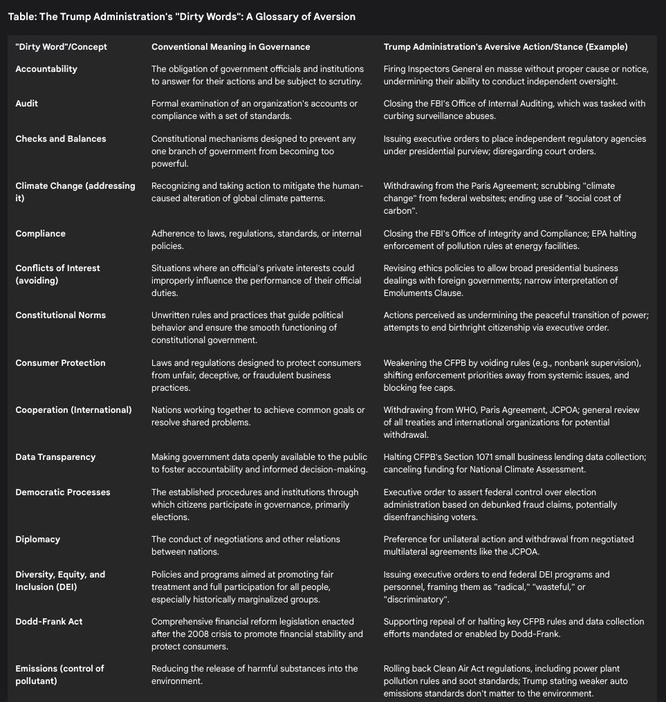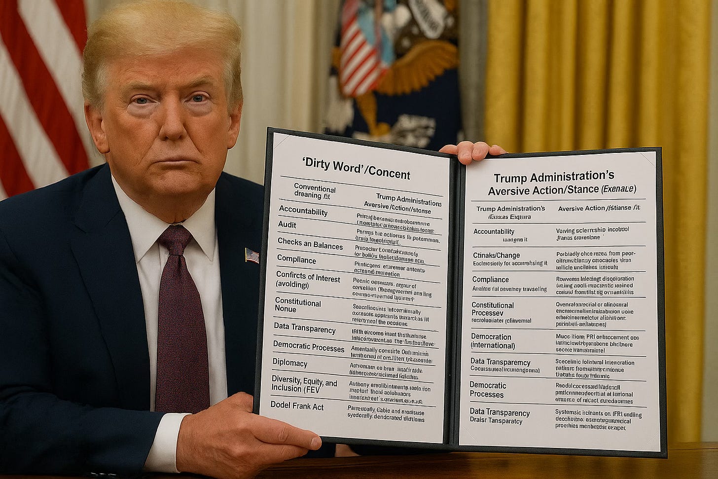 Trump Administration's "Dirty Words" in governance include "audits," "compliance," "integrity," "oversight," "regulation," "international cooperation," "ethics," "rule of law," and "transparency."