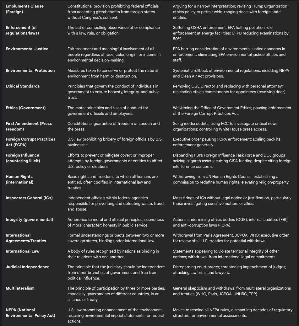 These are not isolated incidents but rather form a coherent pattern of governance where many conventional principles and instruments of responsible, ethical, and legal government are treated as "dirty words"—obstacles to be overcome or ignored in pursuit of the administration's objectives.
