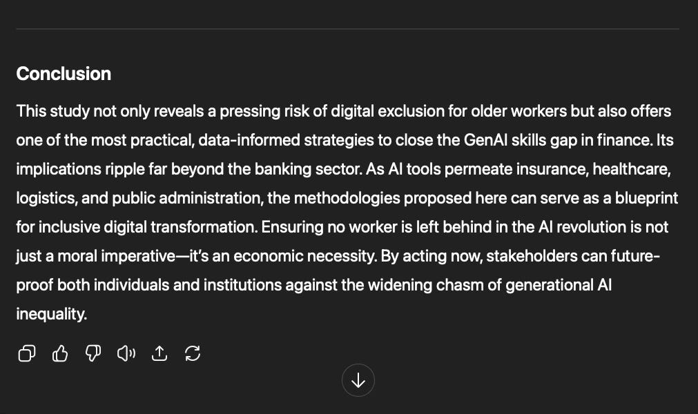 This study not only reveals a pressing risk of digital exclusion for older workers but also offers one of the most practical, data-informed strategies to close the GenAI skills gap in finance. Its implications ripple far beyond the banking sector. As AI tools permeate insurance, healthcare, logistics, and public administration, the methodologies proposed here can serve as a blueprint for inclusive digital transformation. Ensuring no worker is left behind in the AI revolution is not just a moral imperative—it’s an economic necessity. By acting now, stakeholders can future-proof both individuals and institutions against the widening chasm of generational AI inequality.