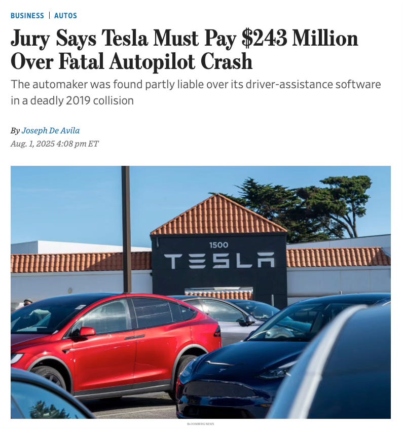 On August 1, 2025, a Florida jury found Tesla partially liable for a fatal 2019 crash involving its Autopilot system, ordering the company to pay $243 million in damages. This landmark ruling — the first time a jury has awarded damages over Tesla’s driver-assistance software — signals a pivotal shift in how emerging technologies like autonomous systems are scrutinized under existing liability frameworks. It sends a cautionary message to the broader AI and tech industry: innovation without adequate safeguards, transparency, and accountability can become a legal and reputational hazard.
