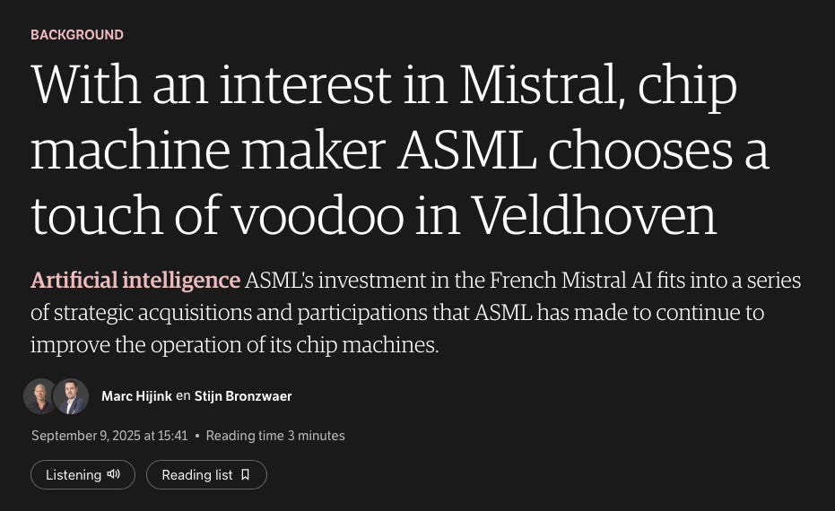 The recent €1.3 billion investment by ASML in the French AI company Mistral AI marks a surprising but strategically coherent expansion of Europe’s most valuable tech company into the generative AI domain. Framed by NRC as “a vleugje voodoo in Veldhoven” (a touch of voodoo in Veldhoven), the move is part of a broader history of calculated acquisitions and partnerships by ASML aimed at preserving its dominance in chipmaking through data, software, and precision control. While the article carries a tone of mild skepticism, especially toward generative AI’s “black box” nature, it inadvertently highlights several profound and valuable dimensions of this decision. Below, I unpack those insights and weigh in on their implications.