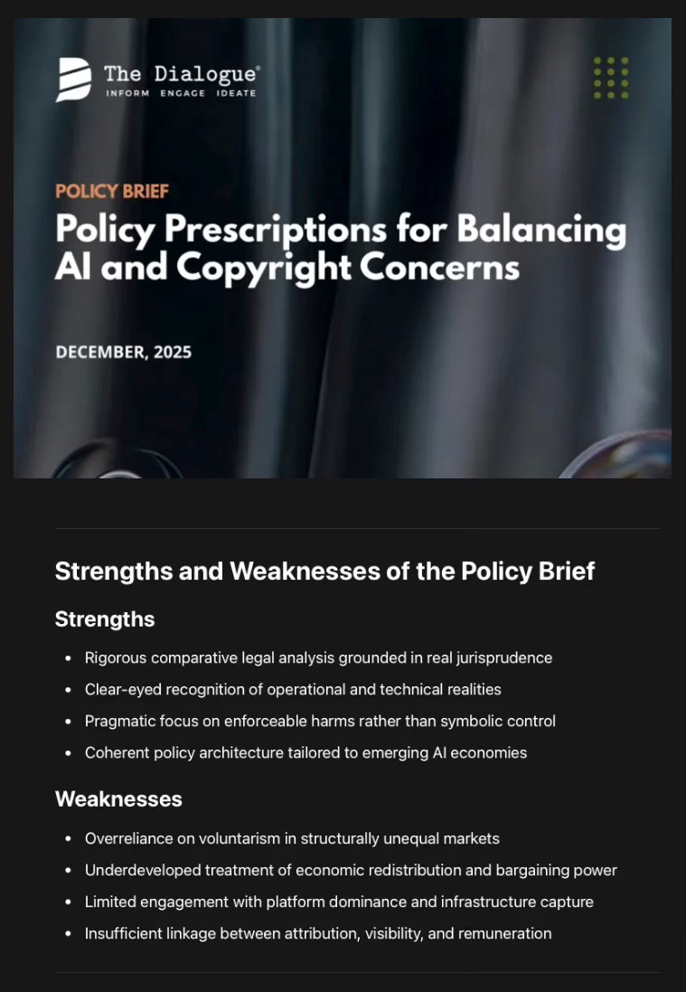 At its strongest, the document recognises that copyright law is being asked to do something it was never designed for: regulate statistical learning from culture at scale. At its weakest, it occasionally underestimates how deeply this shift redistributes power—away from creators and publics, toward infrastructure owners controlling compute, models, and distribution.