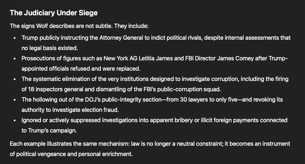 Together, these elements form what Wolf implicitly identifies as an autocratic ecosystem—one that mirrors the kleptocratic systems he encountered in Russia, China, Turkey, and Venezuela, where courts are subservient, dissent is criminalized, and corruption is normalized.